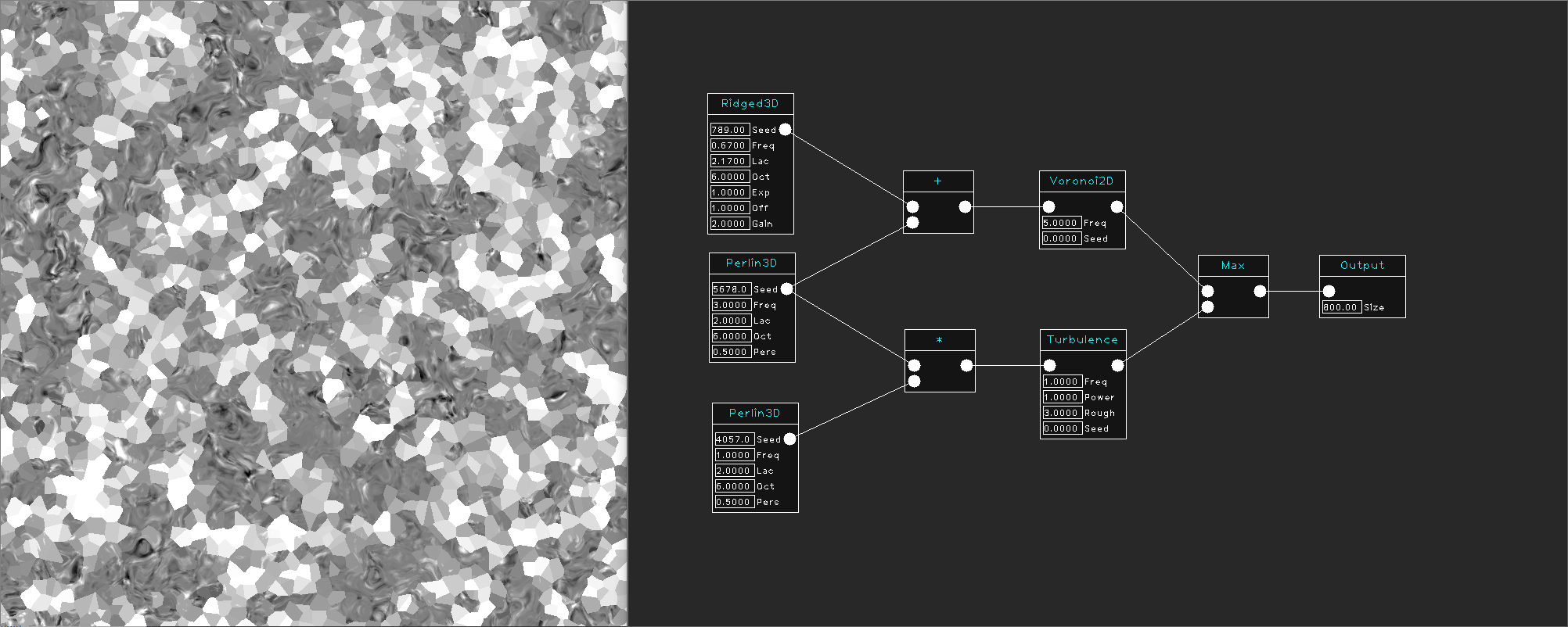 For this project, the Noise Visualization Tool (NVT) was developed. this tool features a node-like system, not unlike for example the Blueprint system used in Unreal Engine 4. Combining different noise generators and modules, a very complicated generator can be created relatively easily. The output is visible in a grayscale image.